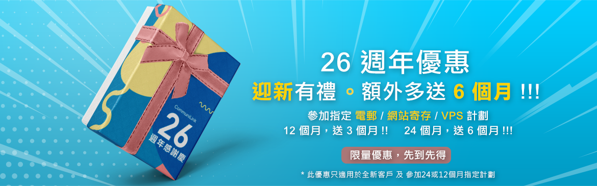 • * 此優惠適用於 CommuniLink 的新客戶, 以及預繳 12 個月 鉑金計劃(SSD WordPress cPanel 網站寄存 / SSD 網站寄存), 優惠期至 2025-12-31。